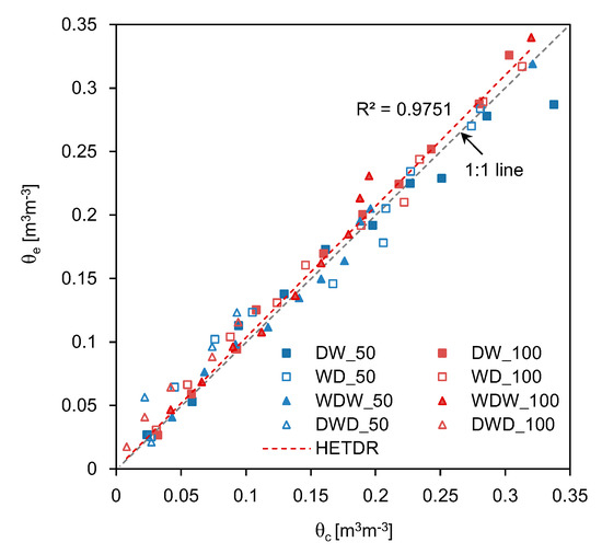 Relationship between the SWCs estimated through the HETDR and conventional TDR probes. θe and θc denote the SWCs estimated from HETDR and conventional TDR probes, respectively.