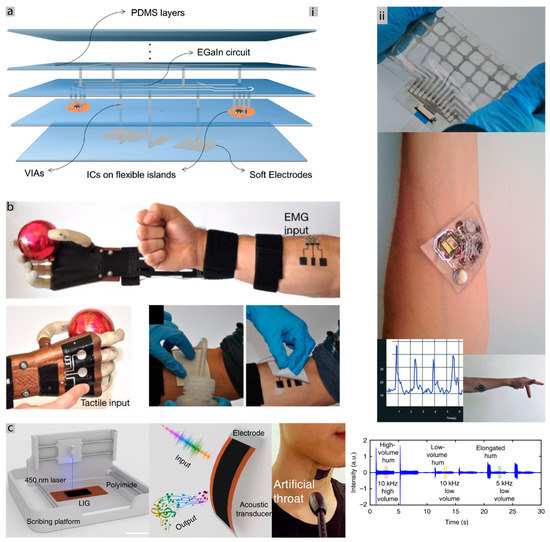 In the last decade, materials and methods for the fabrication of stretchable electronics have progressed rapidly; however, further progress is still necessary for scalable fabrication of these e-skin patches. Materials range from conductive composites, thin metal films, and liquid metals such as the eutectic gallium (EGaIn), that are patterned over elastic substrates using techniques such as laser patterning [101], lithography [102], and direct printing [103,104], high-resolution inkjet printing [105], which we covered in our recent review article [106], although, none of these methods has demonstrated scalable fabrication successfully. Some of these methods include complex steps, costly manufacturing processes and multiple times non-scalable. However, the recent advances in printed and stretchable electronics make the promise that this challenge is being surpassed [31,33,106,107]. We tackled some of the fabrication problems, presenting some methods for making complex flexible PCBs, using an infrared laser, various layers of Polydimethylsiloxane (PDMS) with EGaIn tracks are made using hole vias to communicate between them, also including rigid islands of PCB with chips Figure 3ai. An EMG prototype was built, as seen in Figure 3aii, and can detect the movement of a finger [108], while Figure 3b shows the option of electronic “tattoos” prototyping, which was used to acquire EMG signals and to control a prosthetic hand [85]. Both solutions include cheap and reproducible steps, offering many possibilities in terms of scalability. A good example of the fabrication step for these types of devices can be seen in Figure 3c, where a one-step fabrication of a graphene detector and transducer of sound was produced [97].