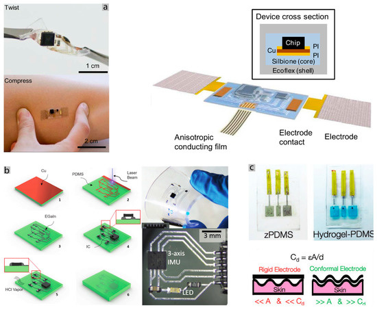 Regarding the skin-device interface, the signal quality is derived from the good contact with the skin and the area available. If the electrode is not conformed to the skin, it will have worse SNR. One example of bad conformity for the skin is the commercial Ag/AgCl electrodes, which are used to acquire bio-signals. They are rigid and can become uncomfortable to use for extended periods. Figure 5c shows a study of conformity regarding electrodes, presenting a relation between the conformity with the skin and SNR. In this study, the hydrogel electrodes and tattoo ultra-thin electrodes were able to have a better SNR and adhesion than the commercial solution. Figure 5a shows an example where an Ecoflex shell system allows for good conformity to the skin for embedding an electronic mechano-acoustic sensor, with interfacing between interconnects and rigid components. While in the extremities, two reusable gold electrodes assure a good interface with the skin [98].