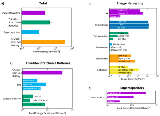 Figure 6 compares the areal energy and power density of some of the recent works in this area, including thin-film flexible or stretchable solutions for energy harvesting or energy storage. Figure 6a shows a comparison of all these categories with a commercial coin-cell lithium battery. Bear in mind, that for comparison, batteries were considered as doing ideal work for one hour at the maximum reported values, while supercapacitors have the power density values reported. Although energy storage and energy harvesting solutions cannot be directly compared together, this graph gives a good overall picture of each of these solutions for the sake of comparison.