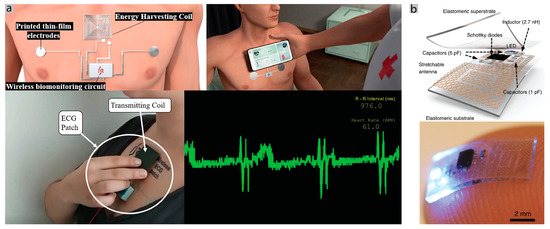 Figure 4a shows the implementation of a patch that integrates a printed silver-zinc battery that is used to power an ECG board. The patch can measure and transmit the heart rate via Bluetooth for about six days [88]. However, in this solution, the electronics circuit is built over a traditional PCB and interfaced with the stretchable printed patch. As an alternative, silicon chips can be integrated into more complex, multilayer circuits which are stretchable.