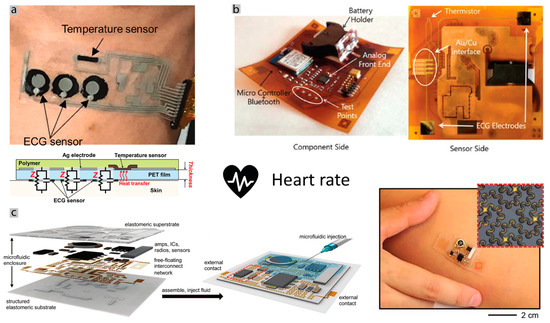 - Yamamoto, Y.; Yamamoto, D.; Takada, M.; Naito, H.; Arie, T.; Akita, S.; Takei, K. Efficient Skin Temperature Sensor and Stable Gel-Less Sticky ECG Sensor for a Wearable Flexible Healthcare Patch. Adv. Health Mater. 2017, 6, 1700495. [Google Scholar] [CrossRef]