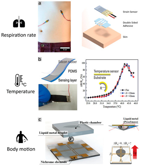 Body temperature constitutes one important health indicator and can be measured with various techniques using an optical signal, using thermal cameras [48] or by contact sensors, including digital thermometers and thermistors [49].