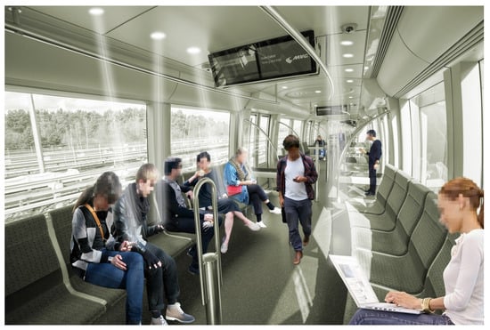 The deployment of LEDs and users considered for the simulations is motivated by the rail wagon scenario described in Section 1. While the LEDs’ positions in all the simulations correspond to the ones shown in Figure 5, the number of users and their positions may change. As explained in Section 2, when designing the precoders, we assume that the second term in Equation (11) dominates the shot noise variance, which is, therefore, practically independent of the received power. In the scenario considered, a train carriage, this assumption is plausible if sunlight is entering the wagon. Nevertheless, after designing the precoders, we evaluate their performance considering all the noise terms, including the term in the shot noise that depends on the received power.