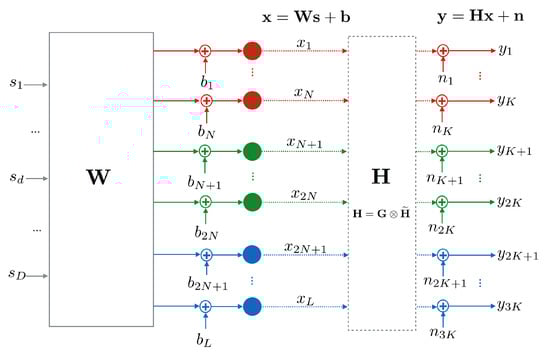 where , is the precoding matrix, is the information-bearing signal, and is the bias vector. The received discrete-time baseband signal is