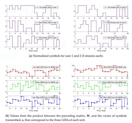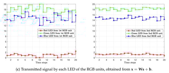 Consider as an example a system with RGB units, each one with one red LED, one green LED, and one blue LED, and users, both supporting 4-PAM. Each of the six LEDs will transmit a linear combination of streams, i.e., three streams per user. Figure 3a,b show the 4-PAM users’ streams and the linear combination of the six streams to be sent by each LED, respectively. Figure 3c shows the final light intensity emitted by each LED that must be within the corresponding LED’s linear dynamic range. Furthermore, the average optical value of each color LED is selected to guarantee a specific color constraint, as we will see in Section 3.