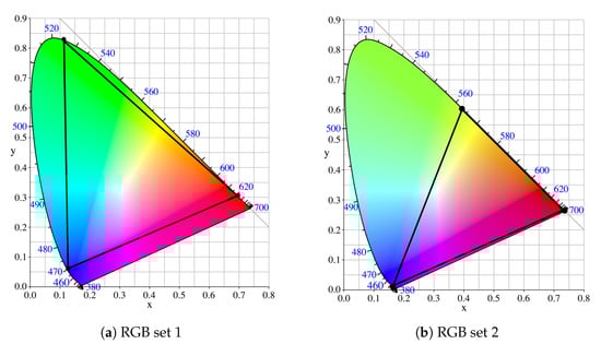 The selected primaries (i.e., R, G, B lights) have been taken from the works in [,], although any set of R, G, B primaries is possible for the VLC system design. The two chosen RGB sets and the respective color proportions are specified in Table 3 and represented in Figure 4. From now on, the first or the second sets will be referred to as RGB-LED 1 and RGB-LED 2, respectively.