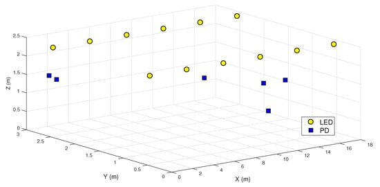 As described in [,], the variables that appear in (7) correspond to the following parameters; the order of the Lambertian source (m), the effective area of the receiver (), the distance between the n-th RGB LED and the k-th RGB PD (), the irradiation angle (), the incident angle (), the gain of the optical filter (), the gain of the optical concentrator (), and the field of view (FOV) of the PDs. The order of the Lambertian emission can be further expressed as