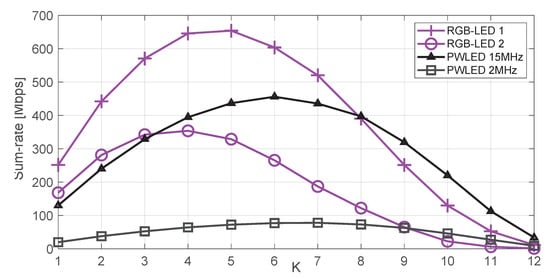 Figure 6 shows the average sum-rate for different values of K (number of users) considering the pseudoinverse precoder (derived in Section 4.1 for an RGB-based system and in Section 5.1 for a PWLED-based system). The results correspond to random realizations. For each independent run, the LED’s distribution is shown in Figure 5, while the users’ positions are random. Figure 6 shows that the sum rate does not steadily increase with the number of users. There are three reasons for this behavior: The first one is the fact that the optical power is limited. The second one is that forcing spatial zeros becomes more difficult as the number of users in a limited area increases. Finally, the inequalities in (23) and (25) account for a worst-case in which the user’s symbols add constructively in the per-LED constraint, and this assumption becomes more pessimistic and challenging as the number of users increases. Therefore, increasing the number of users will constrain the value for each specific user. As expected, the RGB-LEDs of 15 MHz outperforms the PWLEDs of 2 MHz. Figure 6 also shows the performance of a PWLED-based system of 15 MHz, so conclusions can be extracted about the performance of the two systems regardless of bandwidth. Interesting enough, the RGB-LED based system still offers a better performance up to 8–9 users. Then, when the number of users approaches the number of LEDs, the PWLED system outperforms the RGB system, as the latter has to deal with an increased level of interference and the need to force more spatial zeros.