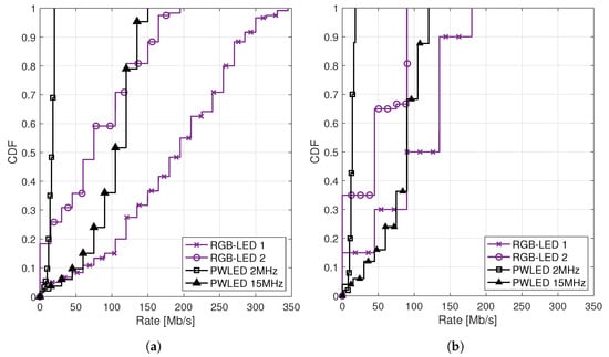 Figure 7 compares the performance of the pseudoinverse precoder (see Section 4.1 and Section 5.1) and the precoder that maximizes the weighted sum-rate, i.e., optimal precoder (see Section 4.2 and Section 5.2). To facilitate the comparison, the weights are set to 1. Figure 7 that shows the Cumulative Distribution Function (CDF) of the rates illustrates again that even if we increase the PWLED BW from to the RGB-LEDs’ BW, i.e., , the PWLED system presents poorer results in terms of rate. This behavior is observed for both the pseudoinverse precoder and the optimum precoder. On the other hand, the optimal precoder outperforms the pseudoinverse significantly. For instance, when considering the RGB-LEDs 1 as transmitters, the worst users achieve nearly with the optimal precoder, while when taking the pseudoinverse they only achieve .