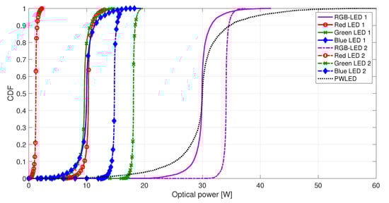 Another aspect observed in both Figure 6 and Figure 7 is the superior performance of the first set of primaries with respect to the second one for the RGB-LED-based system. The fact that the red channel is underused in the second set strongly penalizes the second RGB system, as can be observed in Figure 4b. Instead, the first RGB system provides similar power to the three color channels since , as shown by the CDF of the instantaneous optical power per LED in Figure 8.