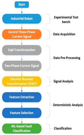 To implement the proposed method, an experimental test bench based on an industrial robot was used. Initially, the data are recorded employing current sensors installed at each of the electric motors’ three-phases. Data are recorded for each motor installed at a specific point of the industrial robot. The current signals data in three-phase is pre-processed, and data dimension reduction is performed to compress the data. The data dimension is reduced using the DQ0 transformation. The DQ0 transformation converts the three-phase current signals to two-phase current signals, without losing any useful information. Using discrete wavelet transform (DWT), the two-phase current signals are further analyzed in the time-frequency domain. DWT breaks down the signals into wavelets, which are further used to extract features. Several features are extracted from the wavelets based on wavelet characteristics and statistics. Then, these features are analyzed using feature selection algorithms to select the most prominent and deterministic features. Upon determining the prominent features among the extracted features, ML-based classifiers are trained to categorize among the various classes of faults. A detailed description of each step is given in the subsequent subsections.