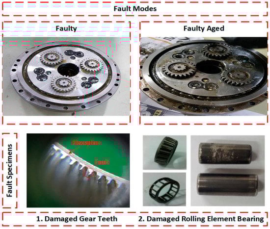 Figure 7 shows the fault modes with an example of a fault specimen. The robot was made to operate in all directions along each axis of rotation for several cycles. One cycle refers to the completion of one range of motion along one axis. The data were recorded for 10 cycles for each axis. Subsequently, the motors were operated at different speed profiles ranging (10 to 100) % of the rated speed to observe the effect of the change on the speed of fault detection and diagnosis system.