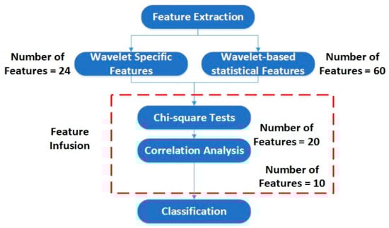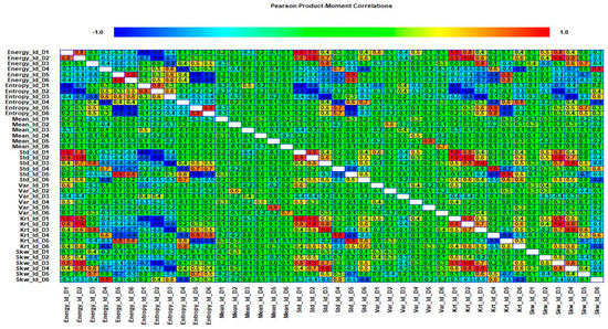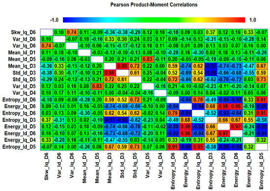 In this case, to evaluate the difference in performance between the chi-square test and correlation analysis, we utilized the correlation analysis, rather than chi-square tests, to select the prominent features from both the wavelet specific and wavelet-based statistical features. The correlation analysis is used to determine the correlation between two variables. These variables can be two independent or a dependent and independent variable. We measure the Pearson product moment coefficient of correlation, in particular, as a sample correlation. The sample correlation coefficient is represented by