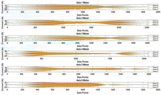Figure 5 shows the basic block diagram of the data acquisition process for one axis motor. The current sensors used for this purpose were the Hall Effect Base Linear Current Sensors WCS6800. The current sensors are installed on each phase of the electric motors, i.e., 18 current sensors in total to record 18 current signals for 6 electric motors. The current signals for each axis motor are recoded using NI DAQ 9230 modules. This data acquisition module sends the recorded data to a PC with LabView installed on it. The received signals are analyzed, and a final database comprising of the signal information for each axis motor’s three-phase current signals is formed.
