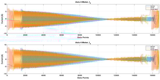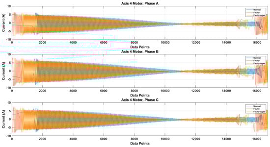 Figure 15 shows the three-phase current signal for the 4th axis motor under normal, faulty, and faulty_aged scenarios. These three-phase current signals were converted to two-phase using DQ0 transformation to achieve the reduced data dimensions.