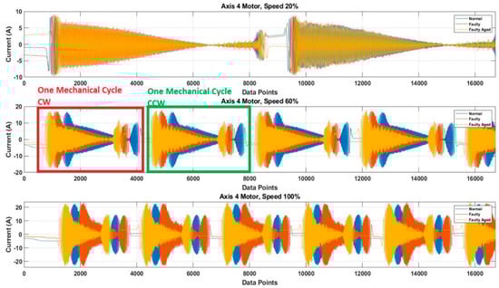 Figure 14, it is clear that for a robotic arm like the Hyundai Robot, the mechanical couplings along the robotic arm do not affect the current signals of another motor. This gives the possibility of focusing on only single-axis current signature analysis. In case there is some fault in an axis, only that axis current signature analysis would be enough to distinguish the fault, without the worry of the mechanical relation between the different axes of the robot. Based on this and the fault location (RV reducer of the 4th axis), we focused only on the 4th axis current signature analysis. We recorded the current signals for the 4th axis motor under three different fault scenarios: normal, faulty (RV reducer eccentric bearing fault), and faulty_aged (RV reducer aging fault).
