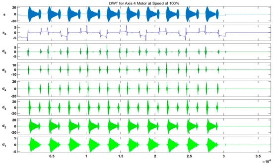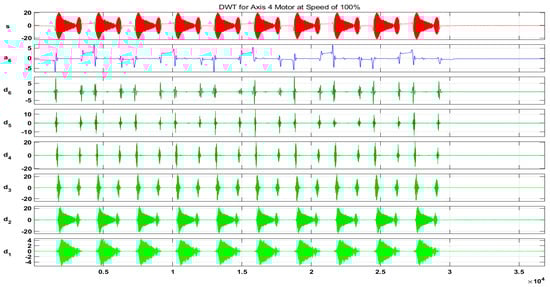 50]. Multi-resolution signal analysis with a good time- and the frequency-localization mechanism is one of its several features. It is effective for both stationary and nonstationary signal processing. The most commonly used method among the wavelet transform is the discrete wavelet transform (DWT). In numerical and functional analyses, a discrete transform wavelet (DWT) is a transform that discreetly samples the wavelets. In comparison to the other wavelet transforms, a crucial advantage it has over Fourier transforms (frequency-domain analysis) is temporal resolution, capturing both frequency and location information (location in time). Therefore, in this work, we selected time-frequency domain analysis using DWT to analyze the signals recorded under different fault conditions.