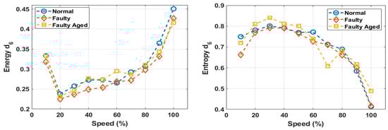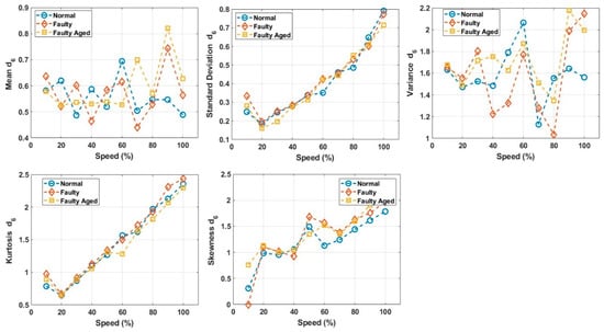 Figure 22 shows the response of the wavelet-based statistical features extracted at different speeds of rotation of the motor. The presented results are for the detailed coefficient