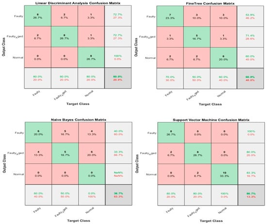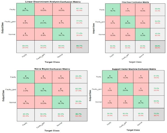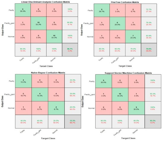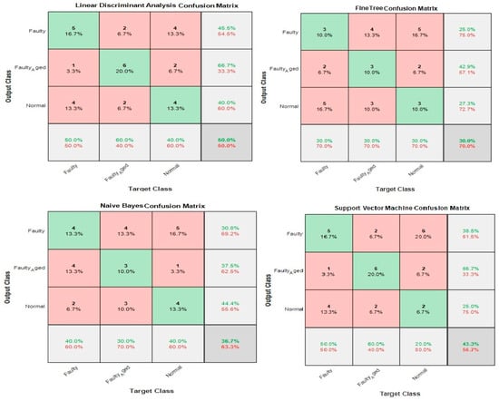 56], proposed methods where chi-square features were used to classify the faults. Different classifiers with a different number of features were used for this purpose. The accuracy achieved was different for the different number of features. For eight features, the accuracy was 93.33% but for seven features the accuracy reduced to 92%. Just reducing one feature reduced the accuracy by 1%. Compared to our proposed methodology, we presented a consolidated approach for feature extraction and selection giving us the advantage to reduce the number of features and achieve higher classification accuracy at the same time. On the other hand, Konar et al. [
