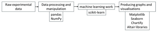 All the data analysis detailed in this paper was conducted directly from the raw experimental data from [12,37]. All of the work described in this document was conducted using the Python programming language [26] and various data science packages and libraries. All data processing and manipulation were performed using the pandas [38] and NumPy [39] libraries. The machine learning work was conducted using the scikit-learn library [40], and all graphs and visualisations were produced using the Matplotlib, Seaborn, Chartify and Altair libraries [41,42,43]. It is shown as a flow chart in Figure 2.