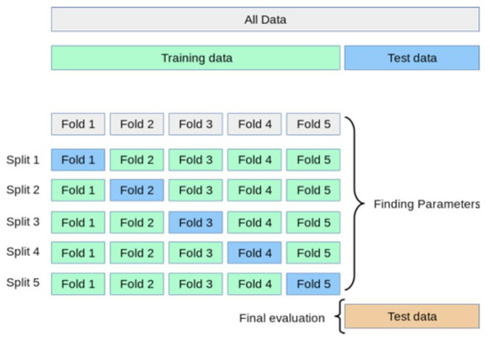 During model training, it was essential to determine the performance of the model without violating the “test on unseen data” principle. This was accomplished by implementing a K-fold cross validation methodology. The K-fold cross-validation method used in this research is shown in Figure 3. The model was used to predict values for the entire dataset once the final one obtained good performance on the K-fold cross-validated training score and the reserved test set.