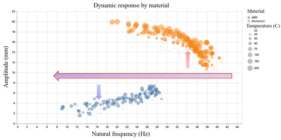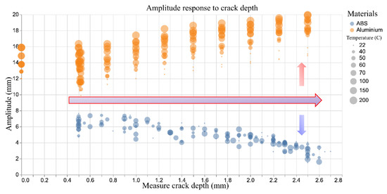 For the aluminium samples, increasing crack depth and temperature leads to a higher tip amplitude. This is the expected effect of a reduced natural frequency and can be easily rationalised to the detrimental effect of a crack in the specimen. The ABS, however, exhibits the reverse behaviour; as the crack depth increases, the natural frequency drops as in the aluminium, but the tip amplitude decreases rather than increases as shown in Figure 5. This can be explained by considering the temperatures tested during the experiments. The maximum temperature for the aluminium specimens is 200 °C, well below the temperature at which any meaningful material transformations may occur during the short duration of the test. The maximum temperature tested in the ABS samples is 70 °C, which is close to the glass transition temperature. This counterintuitive amplitude response is the proximity of the higher temperature tests to the glass transition temperature of the material as well as the effect of stress crazing as discussed before. A more complete view of the relationship between amplitude and frequency in the experimental data is shown in Figure 6.