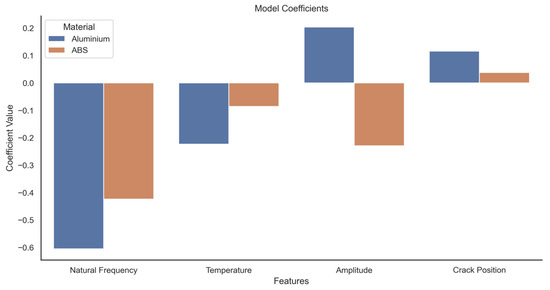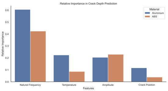The coefficient of natural frequency and temperature appears as important predictive features for Aluminium, and frequency and amplitude for ABS. The crack location appears to be of little importance for both materials. Nevertheless, this might be against the theory which would suggest that the closer the crack to the fixed position, the more pronounced the effect on dynamic response. However, as the crack location is not defined through the theoretical models, in future studies, the training of the data need to be performed using the theoretical models so that more rigorous ML models can be obtained.