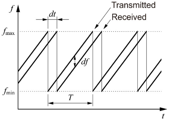 Figure 1. Principle of the FMCW radar. In this plot, the delay d t is exaggerated for the sake of clarity; in practice, the delay is usually smaller by several orders of magnitude than the period T of the sawtooth profile. Similarly, the beat frequency d f is normally much smaller than the frequency span f max f min .