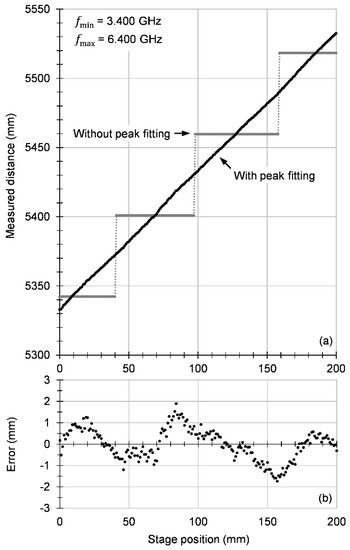 The slope of the data in Figure 4a was determined by linear fitting and turned out to be slightly different from 1, namely 0.996, which for our 200 mm movement represents a drift of 0.8 mm. We believe this was caused by a combination of factors, of which one is the fact that when the stage moves, the cable carrying the signal away from the FMBD changes its curvature, such that the length seen by the signal changes slightly with the stage position; another factor is the waviness of the measured data, which is discussed below. The motor stage is specified to have a positioning error below 15 µm, such that we do not expect it to contribute significantly to the measurement error.