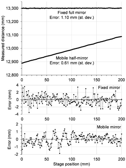Figure 6. Measurement using the setup shown in Figure 5, with the mobile full mirror moved in 1-mm steps over a distance of 200 mm. The top graph shows the measured distance as a function of the motor stage position. The measurement error for each target is shown in the two bottom plots, where the error is defined as the difference between the measured data and a linear fit with slopes 0 and 1 for the fixed and mobile mirrors, respectively.
