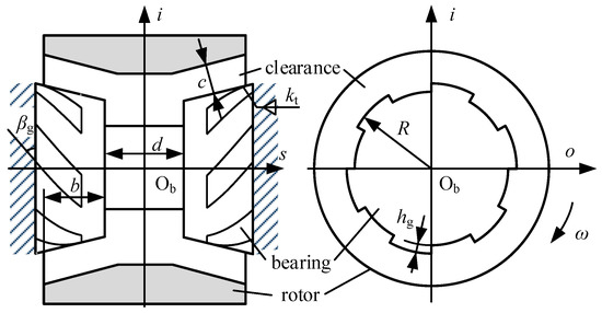 The schematic structure of a gas-dynamic bearing is shown in Figure 2. The rotor is designed to be outside the bearings to get a larger polar moment of inertia, thereby increasing the sensitivity of the gyroscope. The geometry of the bearings is characterized by the bottom radius R, the taper kt and the width b. Grooves are carved on the surfaces in a spiral manner, characterized by groove depth hg and groove angle βg. The clearance between the bearings and the rotor is c, the spacing between the bearings is d, and the angular velocity of the rotor is ω.
