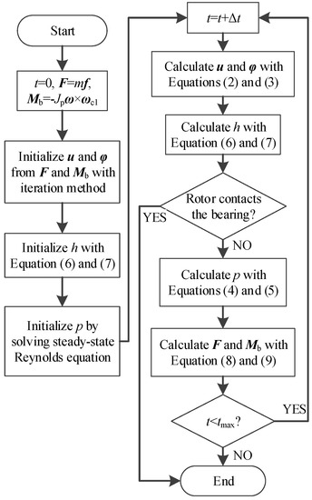 By plugging Equation (14) into Equations (2) and (3), the initial values are obtained as bearing force F(0) = mf1 and Mb(0) = −Jpω × ωc1. The steady-state equilibrium position corresponding to F(0) and Mb(0) is solved by the iteration method to initialize the displacement and tilting angle. The initial values of u and φ are guessed and compared with the corresponding bearing force and bearing moment until they are equal to F(0) and Mb(0). The perturbation method is employed to estimate the stiffness matrix and damping matrix and improve the efficiency of the iteration. The initial gas film thickness and pressure are obtained by solving Equations (4) and (6) with the initial displacement and tilting angle.