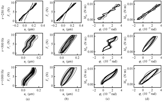 Hysteresis loops of the gas-dynamic bearings. (a) With a triangular perturbation of the force; (b) with a harmonic perturbation of the force; (c) with a triangular perturbation of the moment; (d) with a harmonic perturbation of the moment.