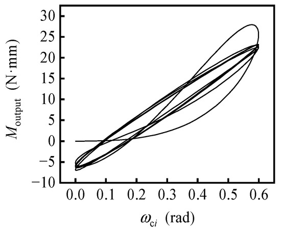 The nonlinear and complex response characteristics of the gas-dynamic bearing gyroscope are largely caused and reflected by the hysteresis effect of the gas-dynamic bearings. Four kinds of one-directional perturbation were added, including triangular perturbation of the force Fi(t) = Fmaxtri(νt), harmonic perturbation of the force Fi(t) = Fmax − Fmaxcos(2πνt), triangular perturbation of the moment Mbi(t) = Mbmaxtri(νt) and harmonic perturbation of the moment Mbi(t) = Mbmax − Mbmaxcos(2πνt). The function tri(*) is defined by tri(x) = 2{x} for 0 ≤ {x} < 0.5 and tri(x) = 2 − 2{x} for 0.5 ≤ {x} < 1, where {*} is the decimal part function. The hysteresis loops are presented in Figure 6, calculated with the maximum of the force Fmax = 10 N, the maximum of the moment Mbmax = 0.01 N·m and the frequency ν = 250 Hz, 500 Hz, 1000 Hz, respectively. In general, the higher the frequency of excitation is, the bigger the area of the hysteresis loop is, which is consistent with the conclusion of reference [31]. The amplitude of rotor vibration is larger with the frequency ν = 250 Hz, the half of the rotating speed of the rotor, which could cause the superposition of the force vibration and half-frequency whirl. The hysteresis curves of triangular perturbation in Figure 6a,c show more tortuous and nonlinear compared with the curves of harmonic perturbation in Figure 6b,d. As the moment Moutput to determine the output current is expressed by Moutput = −Mo − u × F·e, the hysteresis effect of the gas-dynamic bearing causes the hysteresis effect of the gyroscope. For harmonic perturbation with ν = 1000 Hz, the corresponding hysteresis loop of the gyroscope is shown in Figure 7, and it has a similar trend to Figure 6d. As a result, the output of the gyroscope is not only related to the current motion state but also to the previous motion state. Therefore, it is necessary to study the transient nonlinear behavior of gas-dynamic bearing gyroscope.