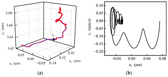 Responses with uniformly changing specific force are shown in Figure 8, calculated with f1 = (−20 −20 −20) m/s2, f2 = (0 −20 −20) m/s2, t1 = 1 ms and ωc1 = ωc2 = 0. When the specific force changes (before t1), the rotor moves smoothly to the new balance position, but mainly in the radial direction, while the axial displacement is small. When the specific force stops to change (after t1), the rotor whirls and spirals up along the axial direction and finally stops in the new equilibrium position. In Figure 8b, when the specific force changes, the speed of the rotor along the i-axis still fluctuates to a certain extent, which is always negative; that is, the rotor moves towards the balance position with speed fluctuating as a result of natural vibration. When the specific force stops changing, the phase trajectory of the rotor oscillates in a small range and tends to converge. In Figure 8c, the net force fluctuates obviously, which shows a coincidence with the speed fluctuation in Figure 8b. The fluctuation decreases in intervals (0, t1) and (t1, ∞) and instantaneously increases at t1. In Figure 8d, the change of the specific force is nearly linear with time, while the specific force changes and fluctuates in a similar manner with the linear underdamping vibration when the specific force stops changing. The method to identify the linear underdamping vibration law is introduced in a previous study [8].