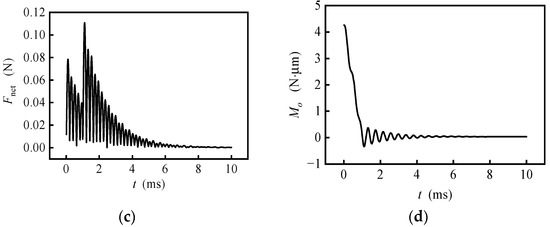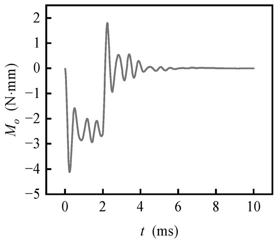 Figure 12 shows the interference torque curves caused by an o-axis change of carrier angular velocity, obtained with f1 = f2 = 0, ωc1 = 0, ωc2 = (0 1 0) rad/s and t1 = 2 ms. The Δωc around the o-axis will produce a negative interference torque around the o-axis, which is caused by the inertia moment of the rotor, estimated by −Jd co = −2.25 N·mm.