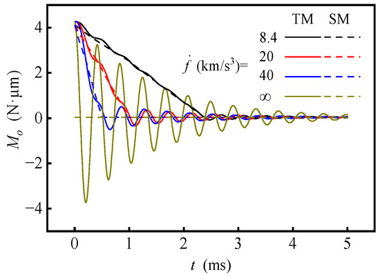 The interference torque curves under different change rate of specific force are shown in Figure 9, calculated with fixed f1 = (−20 −20 −20) m/s2 and f2 = (0 −20 −20) m/s2 and varying t1. The change rate of specific force is expressed by = |f1 − f2|/t1, and = ∞ indicates the sudden change of specific force. The results are obtained by the following two methods: (1) the aforementioned transient method (TM) solving the transient Reynolds equation and rotor dynamic equation simultaneously, (2) the steady-state method (SM) ignoring the squeezing effect of the gas film proposed in a previous study [7]. The fluctuation of the interference torque curve increases with the increase of the specific force change rate. The sudden change of specific force causes larger fluctuation than the others, while the uniform change of specific force will not cause severe vibration. Even if the specific force change rate is as high as 40 km/s3, it should not be simplified as a sudden change. The interference torque curve is approximately a straight line when the specific force changes uniformly and remains constant when the specific force stops to change. The interference torque curves obtained by the two methods almost coincide with < 8.4 km/s3, which is consistent with the deduction in reference [7].