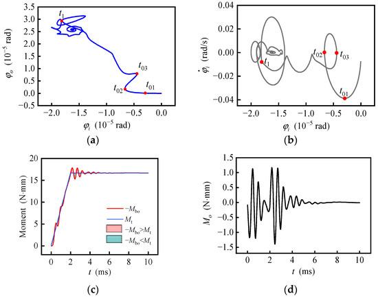 Response with uniformly changed angular velocity. (a) Tilting motion track; (b) phase portrait of tilting motion; (c) the reaction moment of the bearing moment and its theoretical value; (d) time response of the interference torque.