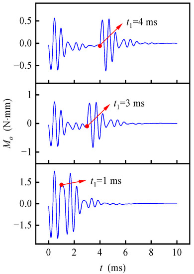 Figure 11 shows the interference torque curves influenced by a variety of angular acceleration, obtained with f1 = f2 = 0, ωc1 = (0 0 0) rad/s, ωc2 = (1 0 0) rad/s and t1 = 1, 3, 4 ms, i.e., c = 1000, 333.3, 250 rad/s2, which indicates that a smaller angular acceleration causes a smaller fluctuation of interference torque.