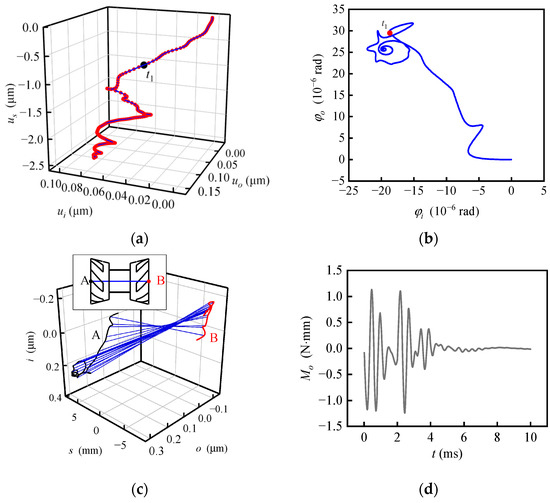 If the specific force and angular velocity of the carrier change uniformly at the same time, response is presented in Figure 13, calculated with f1 = 0, f2 = (0 0 10) m/s2, t1 = 2 ms, ωc1 = 0 and ωc2 = (1 0 0) rad/s. The results show that the trajectory of the rotor has a similar trend with the case of only specific force change, while the rotor angular motion track has a similar trend with the case of only the carrier angular velocity change. However, the characteristics of coupling between the two factors are still obvious. For example, after t1 in Figure 13b, the center of the track circle caused by half-frequency whirl shifts to one side with time. Because of the coupling effect of translation and tilt, part of the gas film becomes very thin, resulting in significantly nonlinear elasticity. The larger the radius of the whirl track is, the greater the difference of stiffness for each point on the trajectory circle is, and the greater the offset of the trajectory circle is, which causes the center of the trajectory circle to shift with time. With the decrease of whirl radius, the center of the trajectory circle gradually returns to the quasi-equilibrium position.