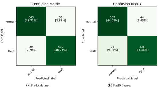 Fault detection was done using the inceptionTime classifier [34] known to have the best performance in the Ford Motor Dataset; the result is depicted in Figure 2. The inceptionTime classifier is known as the state-of-the-art (SOTA) model for classifying time-series data collected in the form of a one-dimensional vector and consists of a 1D-CNN-based architecture. For Ford A and Ford B datasets, the model accuracy was 94.9% and 85.6%, respectively.