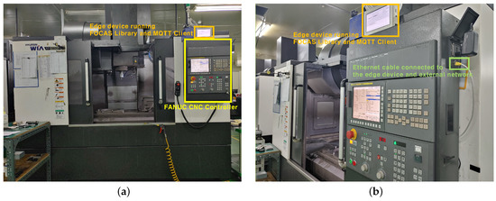 Connection status of MCT and edge device used in the case study. (a) MCT used in this case study. The edge device installed on the top of the CNC controller collects data through the FOCAS library and distributes the collected data through MQTT, (b) The edge device and the CNC controller are connected to an external network that allows access to the data monitoring server via an ethernet cable.