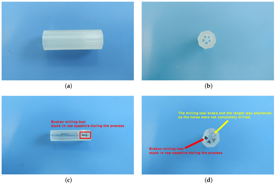 Figure 6 shows the most common product defects that occur in the manufacturing of sapphire nozzles by manufacturers who provided us with an experimental environment. These are defects in which a tool breaks while drilling a hole in the raw material, so that the broken milling tool gets stuck in the raw material. As the milling tool was stuck, the sapphire surface was cracked entirely. Also, since the milling tool breaks during the process, the shortened milling tool cannot wholly drill the hole.