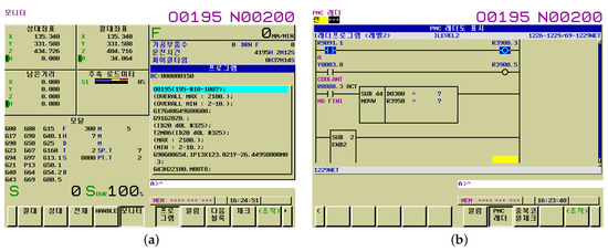 FANUC controller screen corresponding to the collected data. (a) The FANUC controller main screen, the coordinates of the milling tool, and the load are displayed, (b) FANUC controller Laddar screen, We set the number of the currently used milling tool at the PMC address corresponding to R3950.