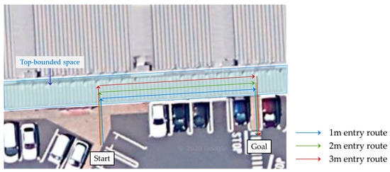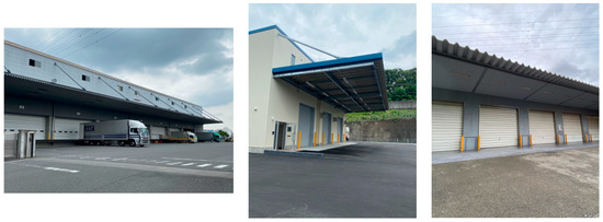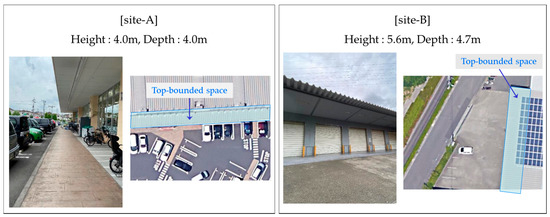 The targeted TBS is a space covered by a large eave, which is commonly seen in logistics facilities, as shown in Figure 1. The space is rectangular when viewed from directly above, with a wall on one long side and no wall on the other sides. As shown in Section 2, seamless positioning methods considering TBSs have been used in some studies, but it is unclear whether these existing methods can be applied to TBSs, as shown in Figure 1, due to the different spatial characteristics between such structures. In addition, the way by which the GPS signals acquired in this unusual environment change has not been sufficiently clarified. To confirm the applicability of an existing method to TBSs and the change in GPS signals during entry into TBSs, we conducted preliminary experiments at two locations with similar characteristics, as shown in Figure 1. The space in which the preliminary experiments were conducted is shown in Figure 2. The target spaces were TBSs with a height and depth of more than 4 m, as the height of large trucks used for unloading and loading at logistics facilities is just under 4 m. The height and depth of the TBSs were measured with a laser rangefinder to see if these conditions were satisfied.