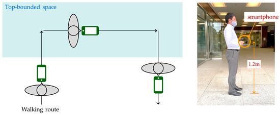 In the preliminary experiments, a tester entered each TBS at a speed of about 1 m/s, walked about 20 m inside the TBS, and returned outside. During the walk, we measured the elevation angle, azimuth angle, and SNR values of each satellite every second in National Marine Electronics Association (NMEA) format using a smartphone application. The walking route in site-A is shown in Figure 3. Three routes, namely, 1 m, 2 m, and 3 m entering the TBS, were set up and measured three times to check the change in values depending on the degree of entry into the TBS. In addition, considering that the configuration of satellites constantly changes with the time of day, measurements were obtained in the morning and afternoon for each site. Each route was measured three times in the morning and three times in the afternoon; thus, there were 18 measurements per site, for a total of 36 measurements. A smartphone, model A (model name: Arrows m4, manufacturer: Fujitsu, Japan, OS version: Android 7.1.1), was used as the measurement device, and the tester walked holding the smartphone 1.2 m from the ground; the smartphone was fixed horizontally with the screen facing upward. Figure 4 shows the holding condition of the smartphone during the experiment.