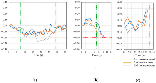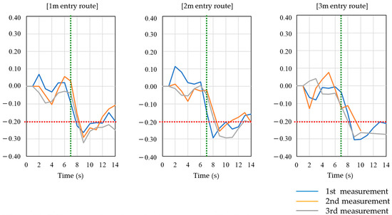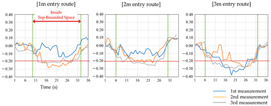 A graph showing the change in the overall satellite SNR average for each route during the afternoon experiment at site-A is shown in Figure 5. This graph is based on the average SNR of all satellites at the start of the walk and shows the percentage change relative to the base value for each second. The green vertical dotted lines indicate the times of entry and exit from the TBS, and the area enclosed by the vertical lines is the time of walking in the TBS. The red dotted line in the graph indicates the boundary of 20% decrease in the average value of the acquired SNR (dB-Hz). The method in [13] uses an SNR reduction of 20% or more relative to the outdoor walking SNR average as the threshold for entry into the corridor-shaped TBS, but this preliminary experiment shows various cases in which the SNR is decreased by 20% or more and cases in which it is not reduced. For example, on the 2-m entry route, the third measurement shows a reduction in SNR of more than 20% at most times, but the first and second measurements rarely show a reduction in SNR of more than 20%. Also, only the second measurement on the 3-m entry route shows a significant difference in the way the SNR changes from the other measurements.