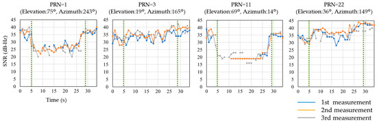 Next, the changes in the SNR values for each of the major satellites are shown in Figure 6. The contents described above each graph are the pseudorandom noise (PRN) code, satellite elevation angle, and azimuth obtained from the NMEA format. As in Figure 5, the area surrounded by the green vertical dotted line is the walking time in the TBS, but the vertical axis shows the SNR value. The changes in the SNR values of each satellite show that the satellites with high-elevation angles show a significant decrease in SNR before and after the receiving device enters into the TBS, while the satellites with low elevation angles show no change in SNR after the receiving device enters. Moreover, the SNR value acquired by each measurement of the same route does not vary greatly, but the value sometimes cannot be acquired. For example, in Figure 6, there are cases where SNRs cannot be acquired for some satellites in the third measurement. With respect to PRN = 11, the SNR was not obtained for much of the time, even in the first measurement. This may be one of the reasons for the variation in the overall SNR average even for the same route. Given that the ratio of satellites with high and low elevation angles always changes because the configuration of satellites always changes, it is difficult for the existing approach (averaging the SNR over the entire satellite) to stably detect the approach to a TBS.