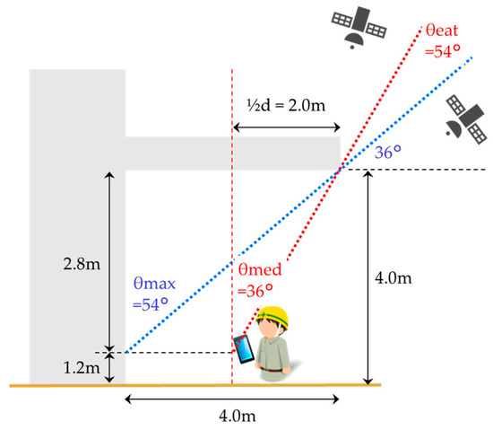 where is the maximum entry angle, D is the depth of the TBS, is the height of the TBS, and is the holding height of the receiving device (smartphone). For example, in the case of site-A, the angle of entry to the deepest point is 54°, as shown in Figure 8. Thus, logically, when a worker with a smartphone enters the depth of the TBS, satellites with elevation angles higher than 36° will be affected by the eaves, and their SNRs will be attenuated. However, in practice, workers are expected to work at shallow angles of entry; that is, without going to the deepest point. To increase the possibility of detecting the TBS stay under such conditions, we set the entry angle based on one-half of the depth to extract the satellites affected by the eaves. In the case of site-A, this entry angle is 54°. In this study, this angle is defined as the entry angle threshold, which can be described by the following equation: